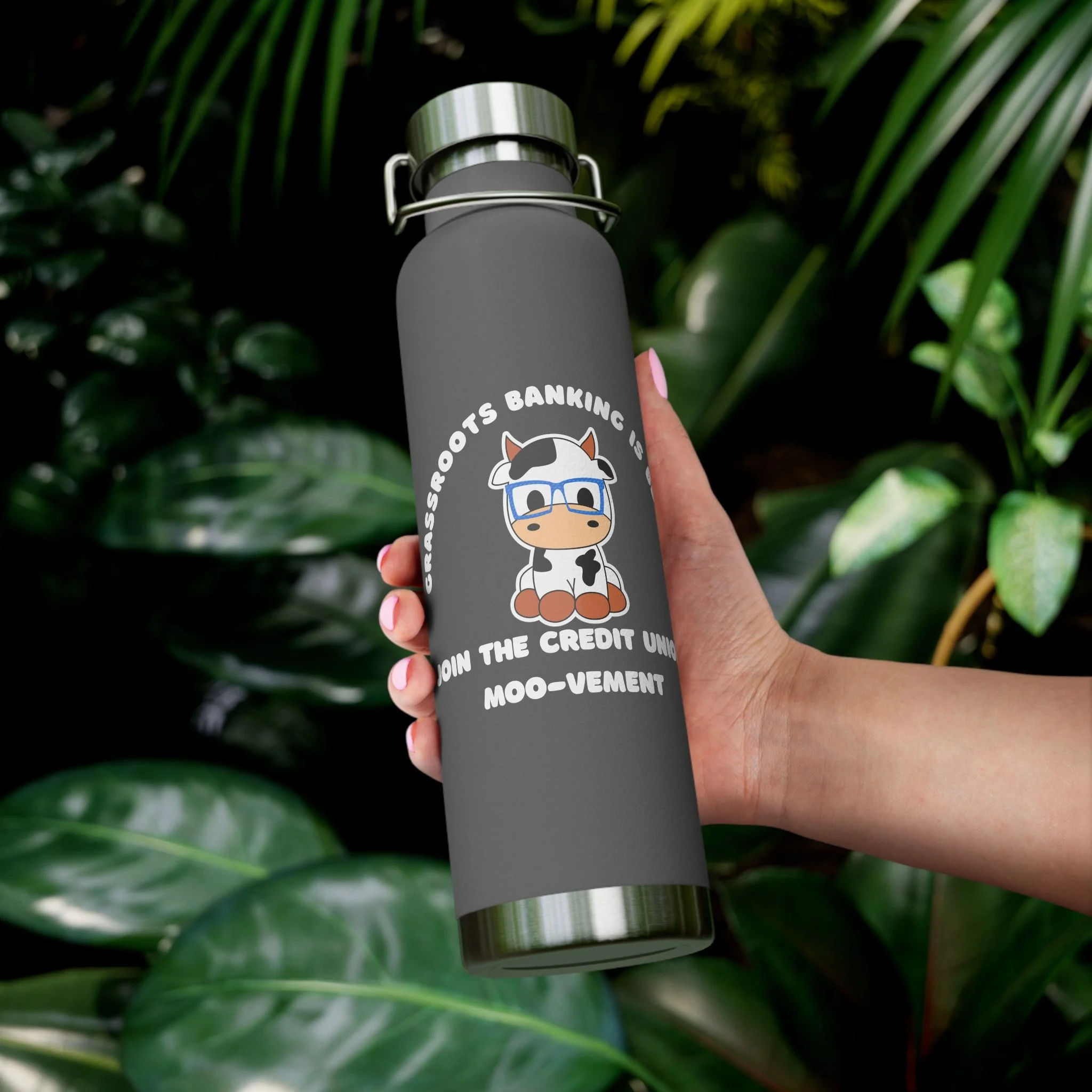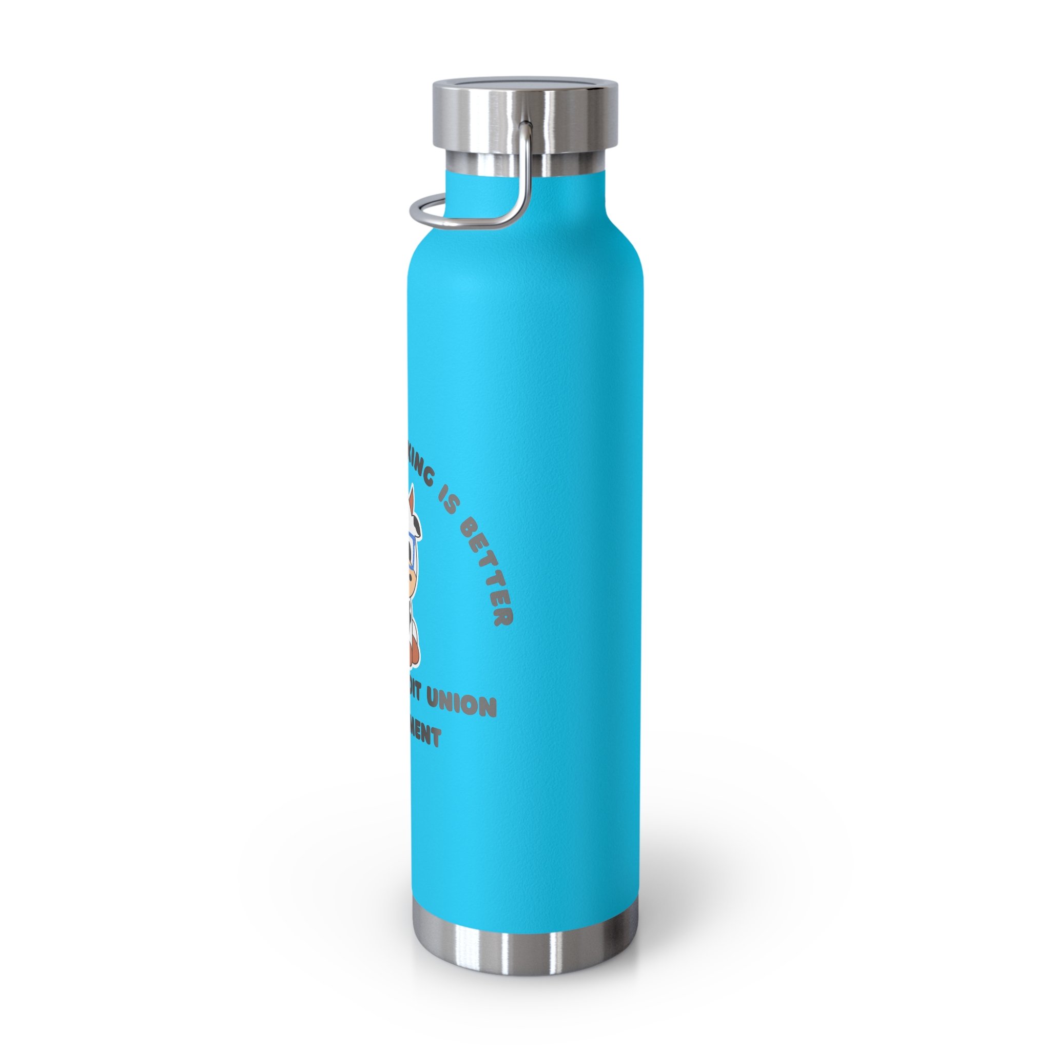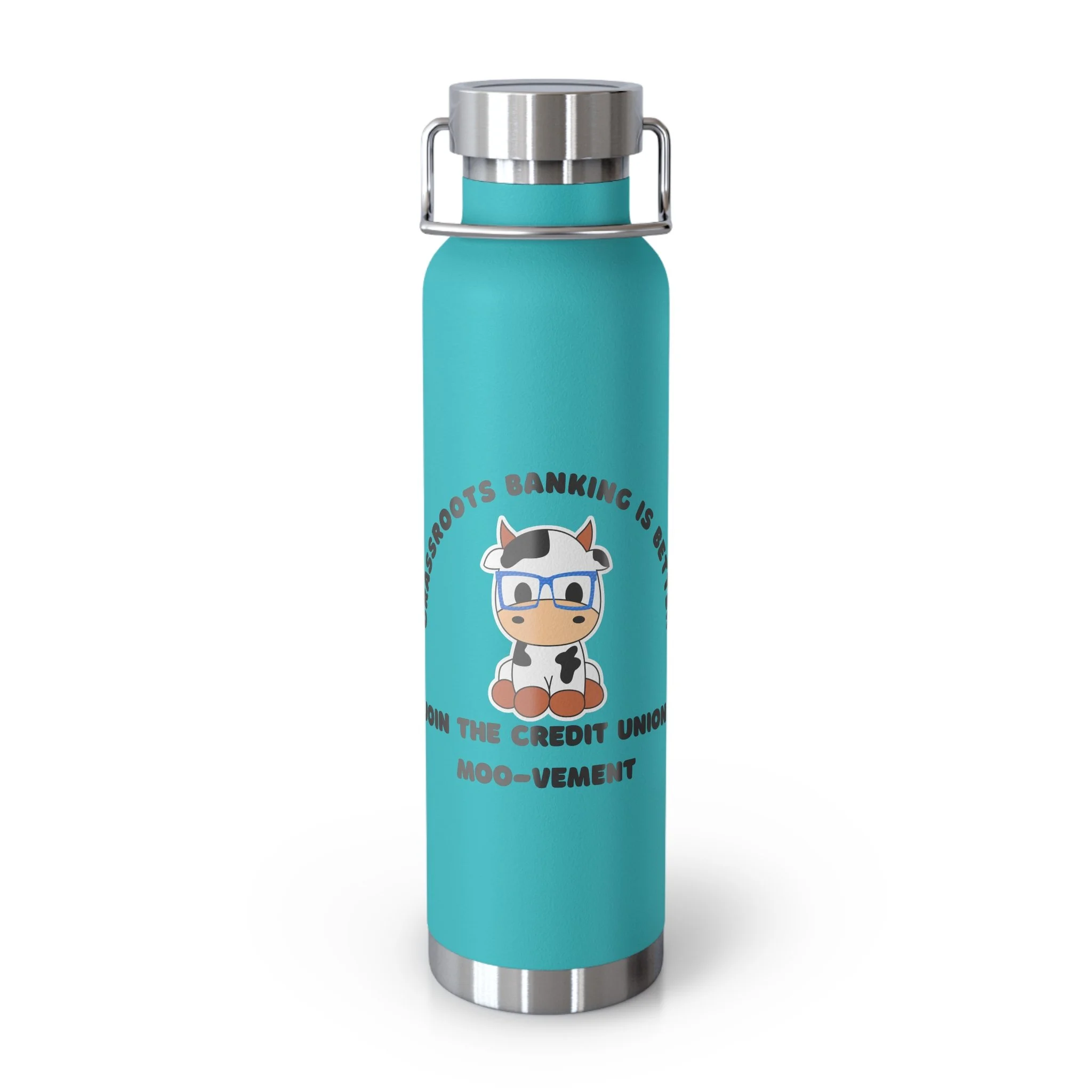 22oz Copper Vacuum Insulated Bottle — 'Join the Credit Union Moo-vement' Cute Cow Design, Stainless Steel Water Bottle