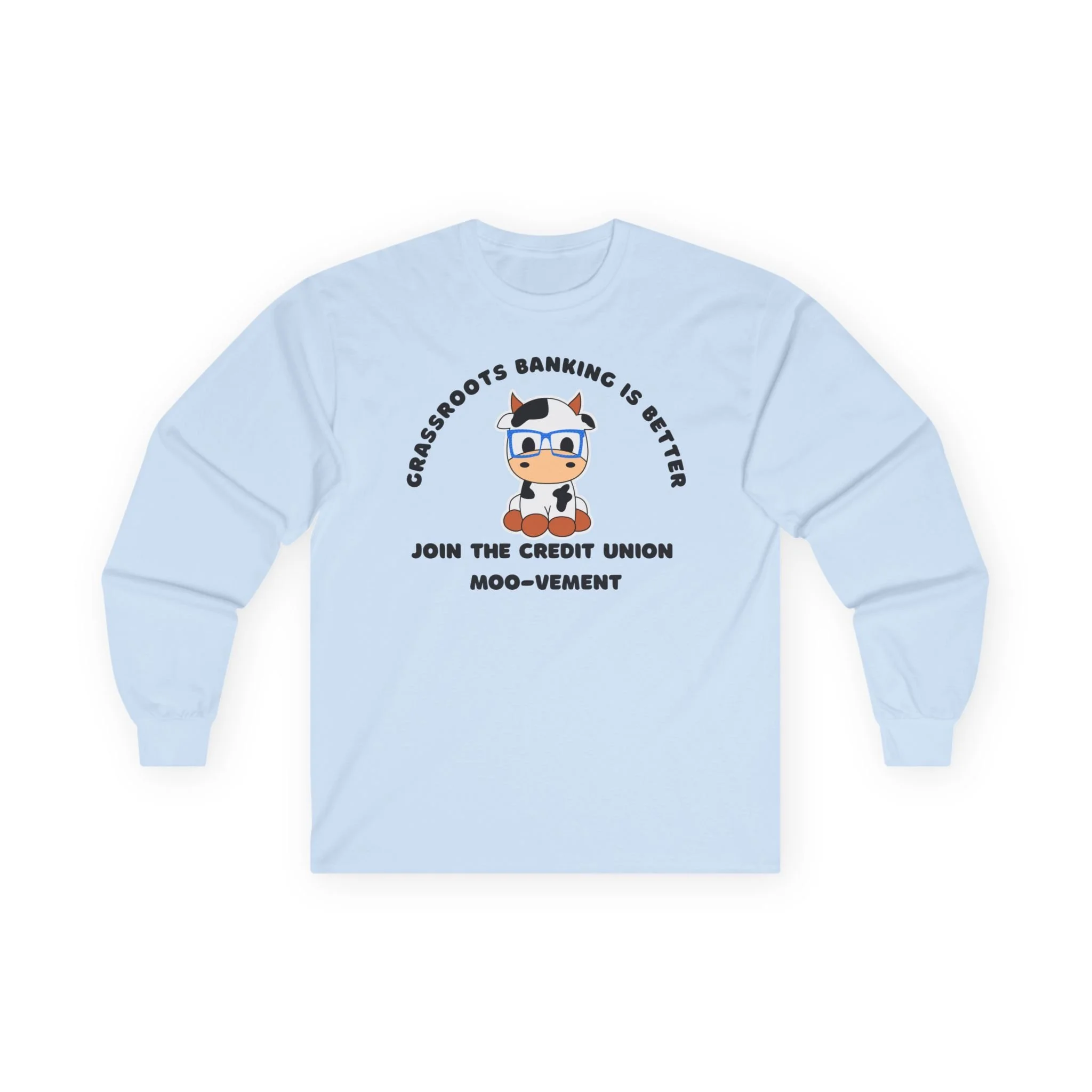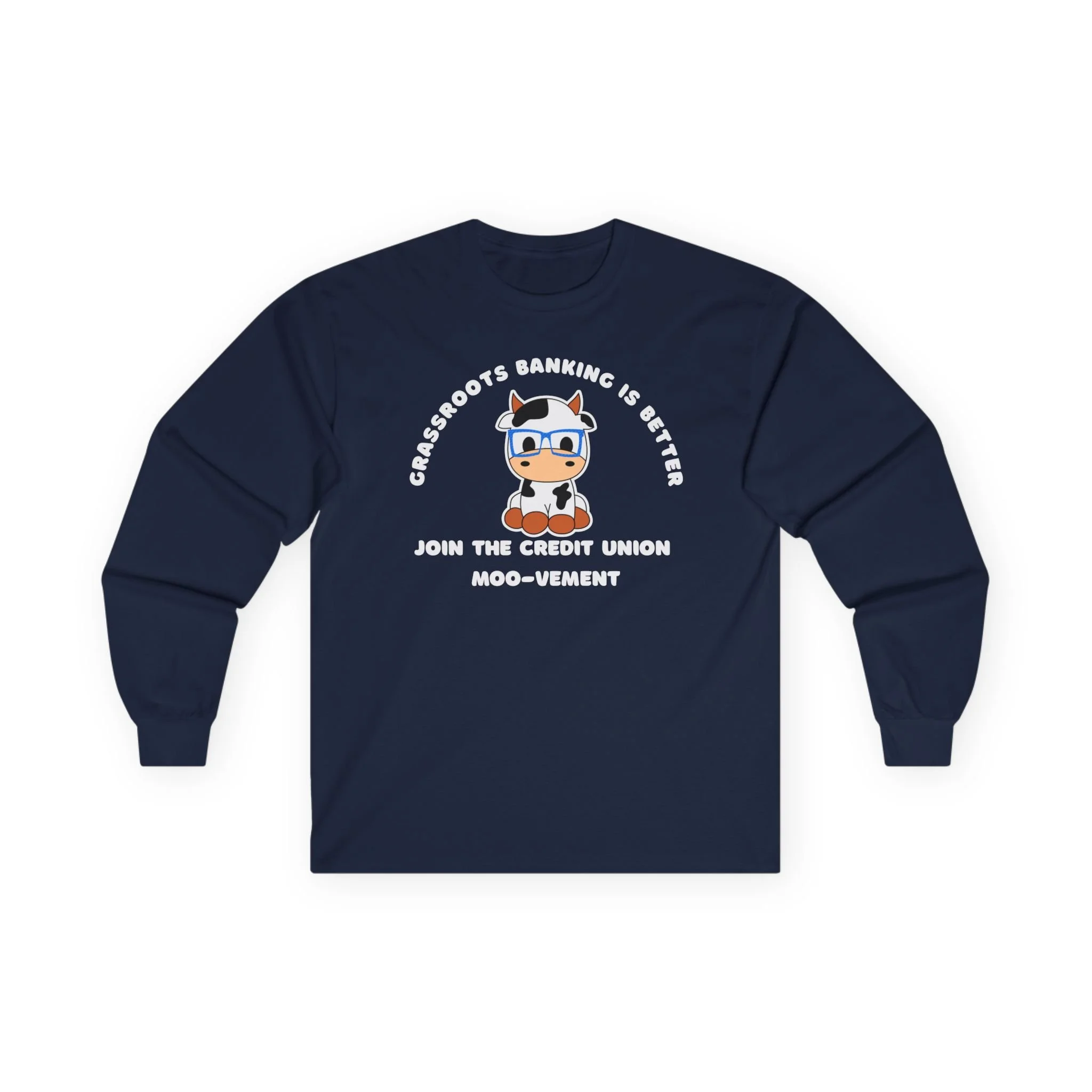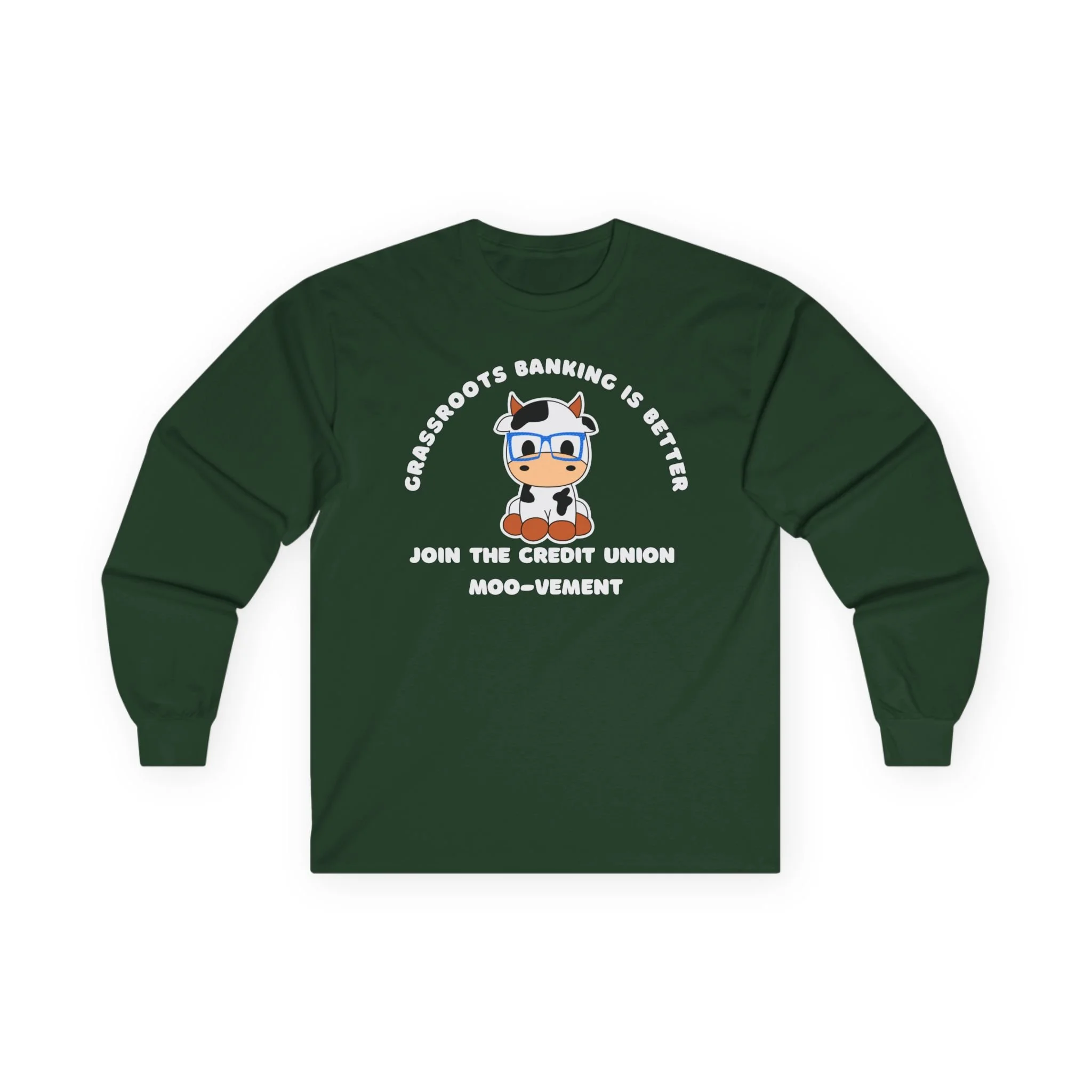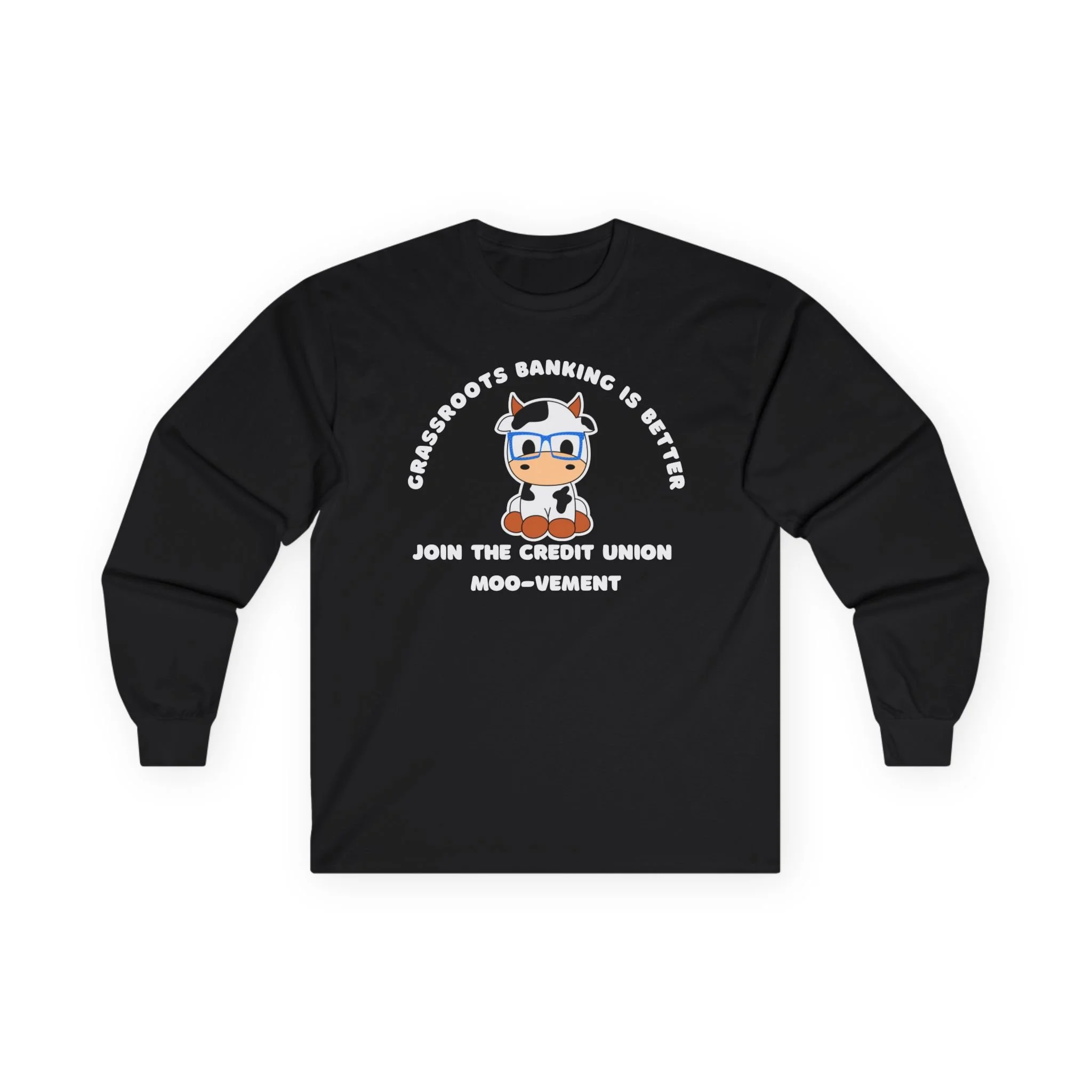 This long sleeve tee features a Holstein cow celebrating the member owned and not-for-profit grassroots banking offered by credit unions. Perfect for those who appreciate quirky and funny graphic tees, credit union employees, or even as a "congratulations on your first high interest savings account" gift. Great for casual wear or as a unique gift for credit union enthusiasts. Ideal for casual occasions, everyday wear, and gift-giving.