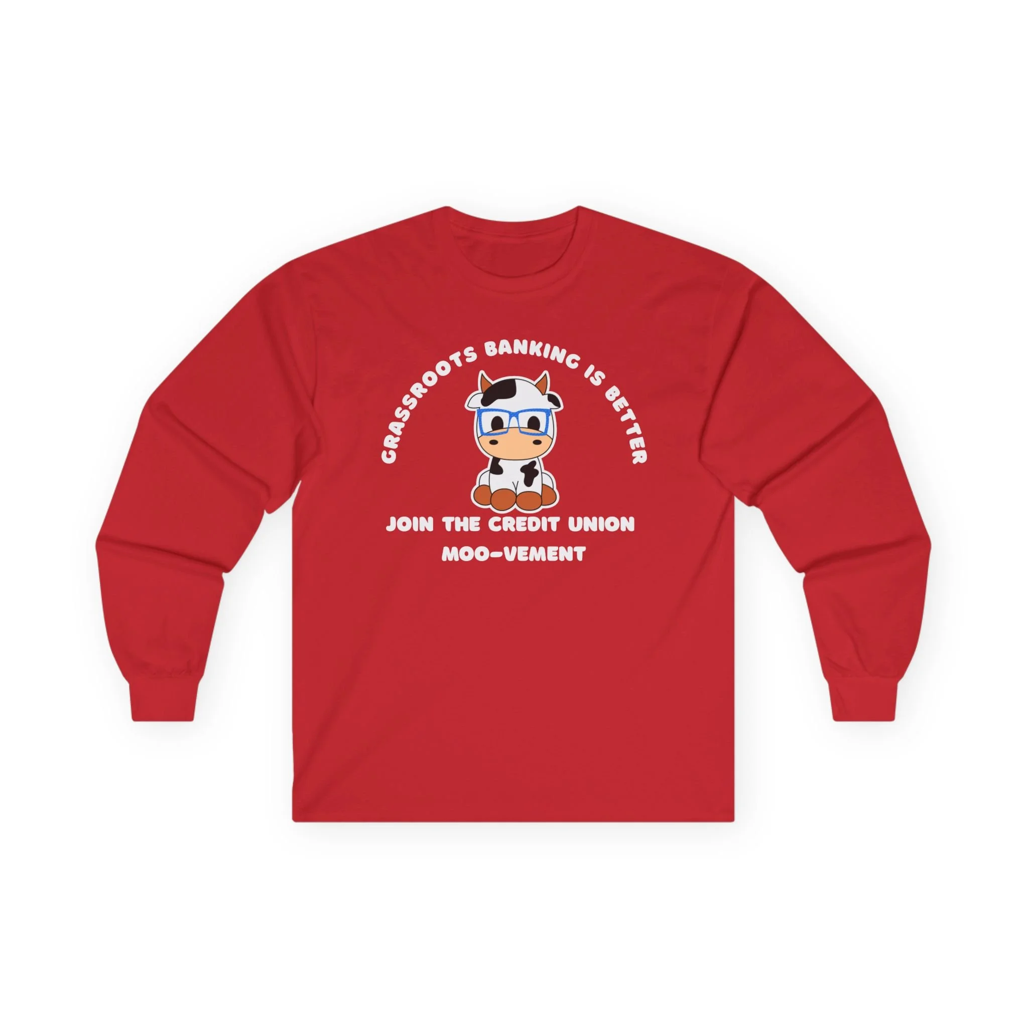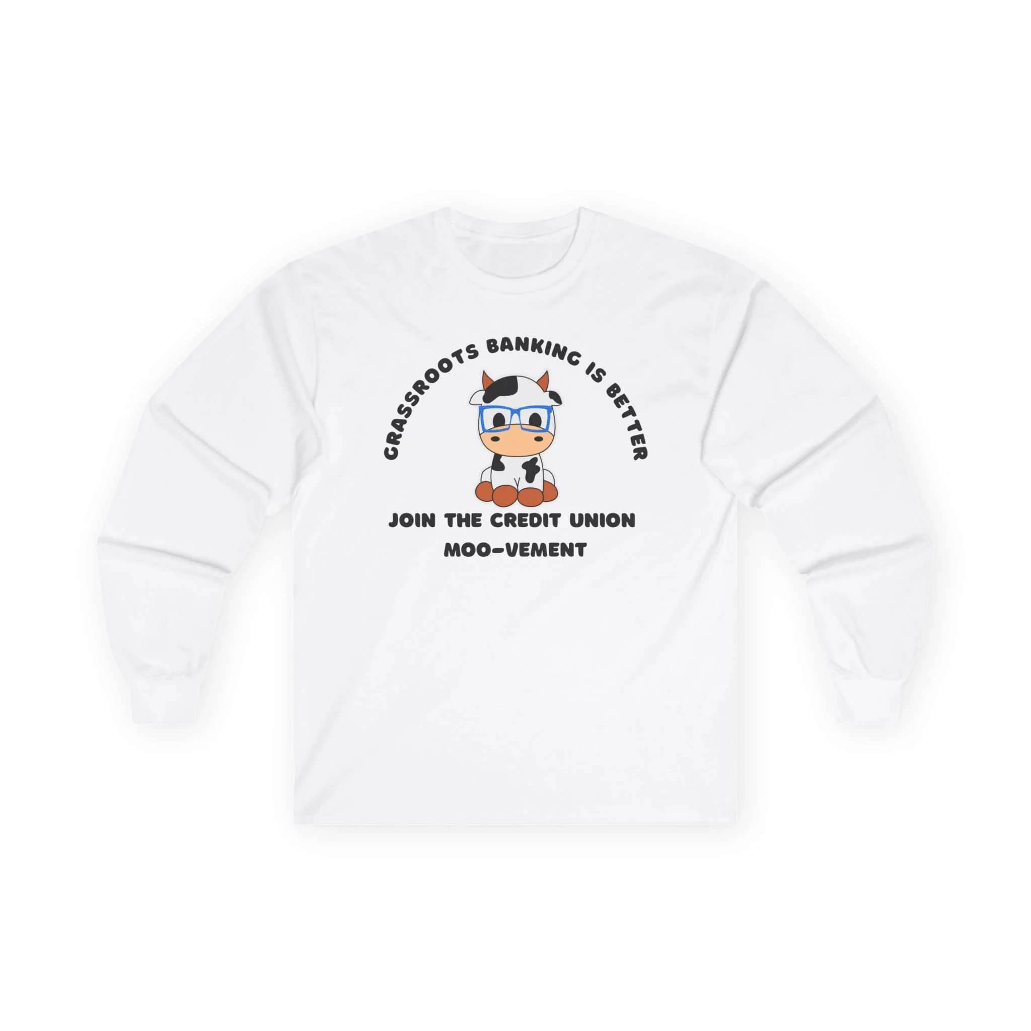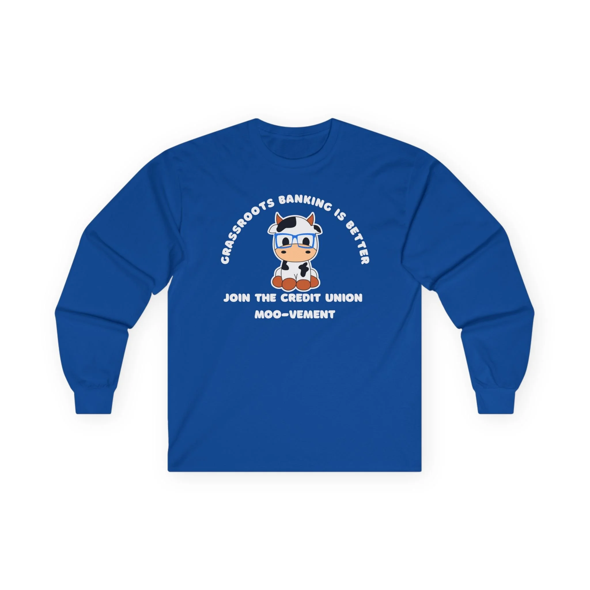 This long sleeve tee features a Holstein cow celebrating the member owned and not-for-profit grassroots banking offered by credit unions. Perfect for those who appreciate quirky and funny graphic tees, credit union employees, or even as a "congratulations on your first high interest savings account" gift. Great for casual wear or as a unique gift for credit union enthusiasts. Ideal for casual occasions, everyday wear, and gift-giving.