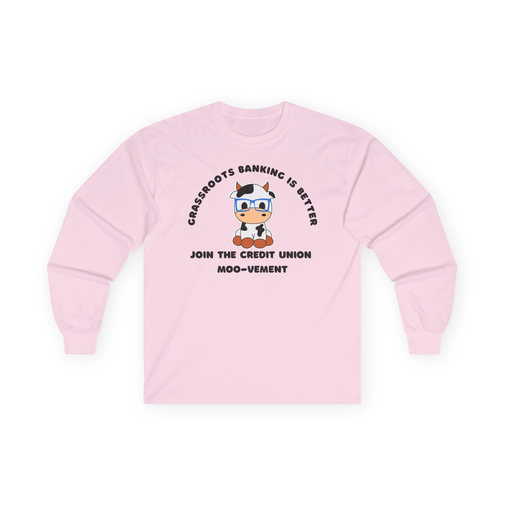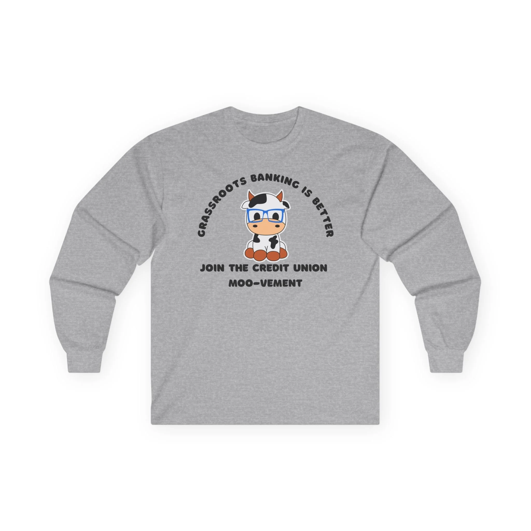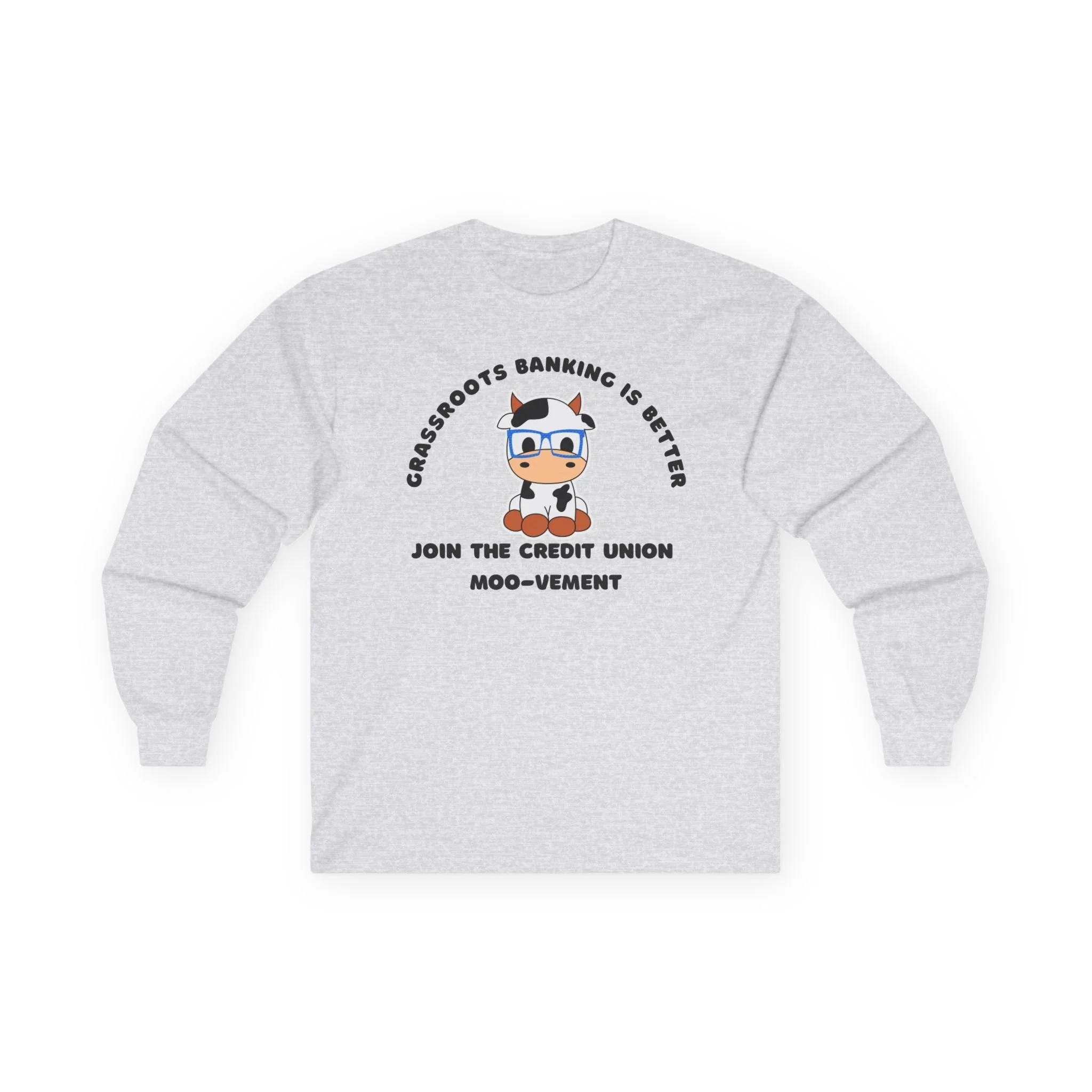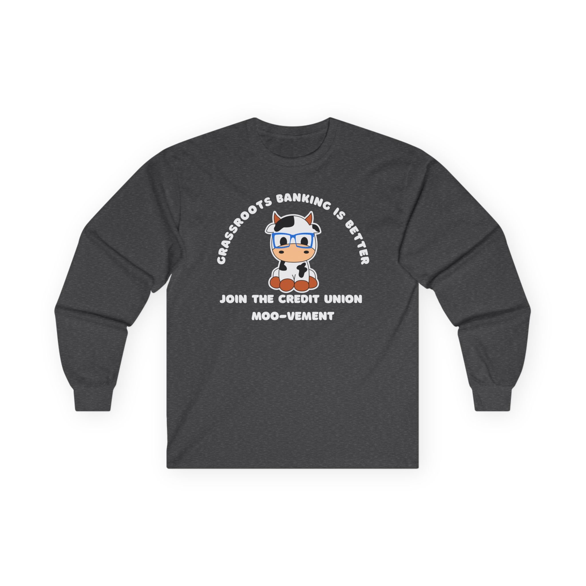 This long sleeve tee features a Holstein cow celebrating the member owned and not-for-profit grassroots banking offered by credit unions. Perfect for those who appreciate quirky and funny graphic tees, credit union employees, or even as a "congratulations on your first high interest savings account" gift. Great for casual wear or as a unique gift for credit union enthusiasts. Ideal for casual occasions, everyday wear, and gift-giving.